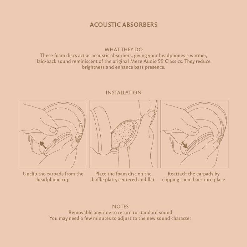 For those seeking a sound closer to the original 99 Classics Headphones' sound signature, the 2nd Gen comes with a set of acoustic absorbers, allowing you to shift the balance towards a warmer signature. Simply detach the ear pads from the cups, place the absorbers in the allocated slots on the baffle plate, reattach the ear pads, and enjoy!