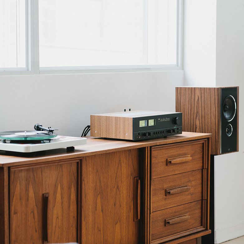 - Retro design elements include front-panel VU meters, push-button input controls, 1970s cursive branding, walnut-finished vinyl-clad cabinet, and dark grey front panel
