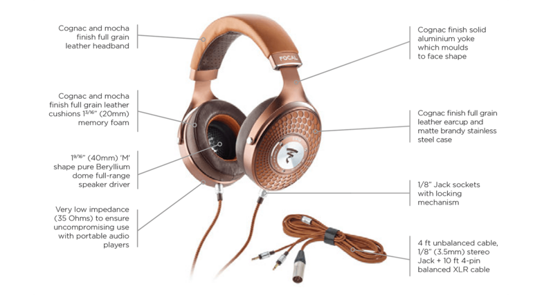 Each component of the Stellia's design has been developed with optimal acoustics in mind, without compromising on style. The cognac and mocha finishes showcase each element and serve as a testament to Focal's build quality and meticulous attention to detail. As a high-end headphone, the Stellia is presented in a faux-leather case, in the same cognac and mocha color scheme. The carrying case houses two high-quality cables with the same materials and finishes—a 4 ft. unbalanced 3.5mm cable with a TRS jack connector for connection to a digital audio player (DAP), and a 10 ft. 4-pin XLR cable for use with a headphone amplifier. The Stellia delivers a very low impedance of 35 ohms to ensure uncompromising audio use with DAPs, achieving an impressive sensitivity of 106dB SPL / 1mW @ 1kHz.