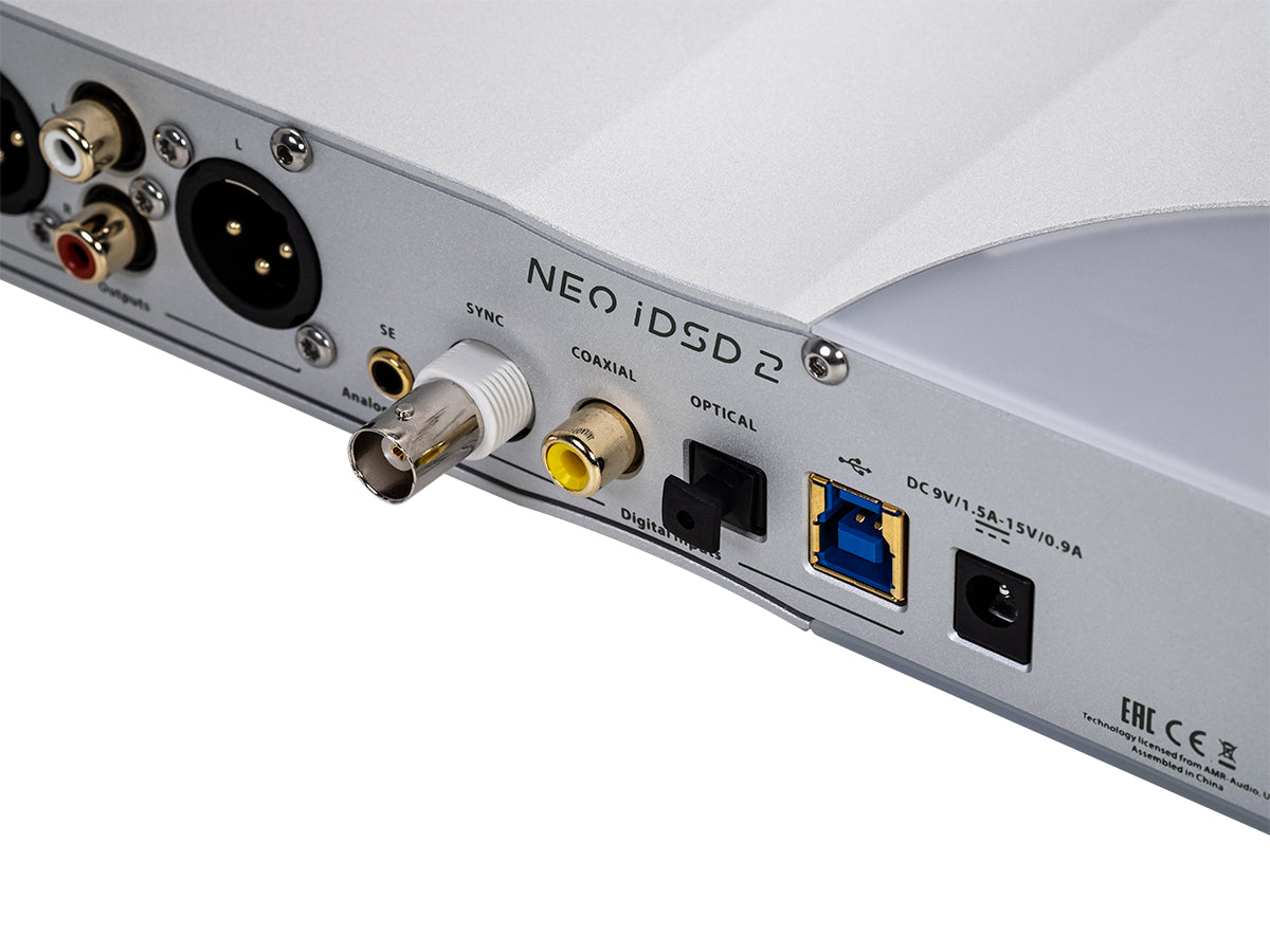 The iFi NEO iDSD 2 Bluetooth DAC/Amp supports USB, S/PDIF (optical and coaxial), 3.5mm analog, and external clock inputs.