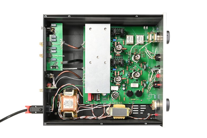 From the input transformer, the signal passes through a precision Stepped Attenuator from Elma Electronic Inc., allowing for accurate volume control while tracking issues or noise common in potentiometer-based designs. The signal then enters the first gain stage, implemented with 6922 (or equivalent) preamp vacuum tubes configured in a push-pull topology–One triode handling the positive phase and one handling the negative phase of the differential signal. The preamp stage directly drives the powerful 6H30P vacuum tube, which is directly coupled to dedicated output transformers (one for each channel) from Lundahl Transformers. This provides a voltage gain of 15.6 dB, resulting in the ability to drive a variety of full-size headphones to adequate listening levels.