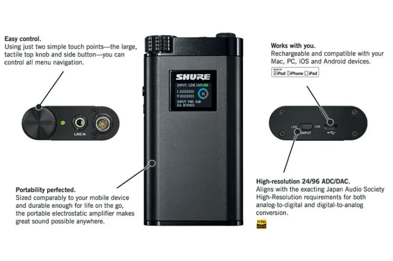 Included with the KSE1500 earphones is a rechargeable USB amplifier. The KSA1500 acts as a DAC or digital-analog converter.